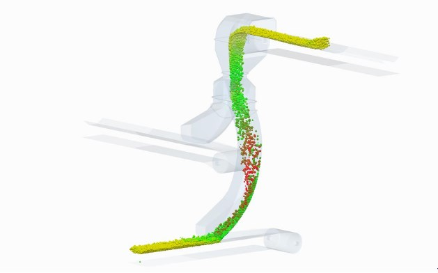 3D曲線溜槽系統(tǒng)技術(shù)基于離散元方法,采用三維軟件設(shè)計(jì)和立體建模技術(shù),借助于成熟的顆粒學(xué)仿真軟件(EDEM),對(duì)散狀物料輸送過(guò)程中顆粒體系的行為特征進(jìn)行真實(shí)的模擬,從而協(xié)助設(shè)計(jì)人員對(duì)散狀物料處理設(shè)備進(jìn)行設(shè)計(jì)、測(cè)試和優(yōu)化。3D曲線落煤管機(jī)頭部位設(shè)計(jì)有弧形集流導(dǎo)流裝置,使料流以較小的沖擊角度(理論切入角小于30°)與導(dǎo)流擋板漸變接觸,以減小料流對(duì)擋板的沖擊;溜槽本體采用弧形流線型結(jié)構(gòu),截面形狀多為“U”形或圓形截面;出料口采用向前擴(kuò)容變截面的匙形結(jié)構(gòu),并深入導(dǎo)料槽內(nèi)部,距離皮帶底部150---350mm左右。3-DEM曲線溜槽技術(shù)通過(guò)匯集物料,實(shí)現(xiàn)不規(guī)律散狀物料的可控化,從而防止溜槽堵塞、減小沖擊、抑制誘導(dǎo)風(fēng)、降低粉塵濃度等。3D曲線落煤管技術(shù)技術(shù)保證物料以接近膠帶的速度平行膠帶進(jìn)入下一級(jí)膠帶,減小物料對(duì)膠帶的沖擊,杜絕膠帶撕裂現(xiàn)象,同時(shí)保證物料同膠帶對(duì)中良好,提高膠帶輸送效率。